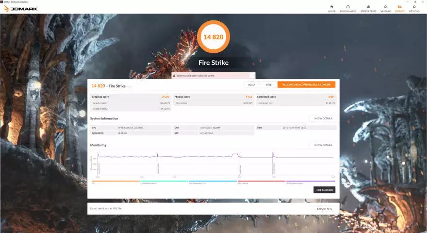 从3DMark 的跑分来看,GT73VR 里的 GTX 1080 在性能上,跟桌面版的 GTX 1080相差无几,这台笔记本要比 Eurocom X8(GTX 980M SLI)快20%,以及要比桌面版的 GTX 980 快70%。