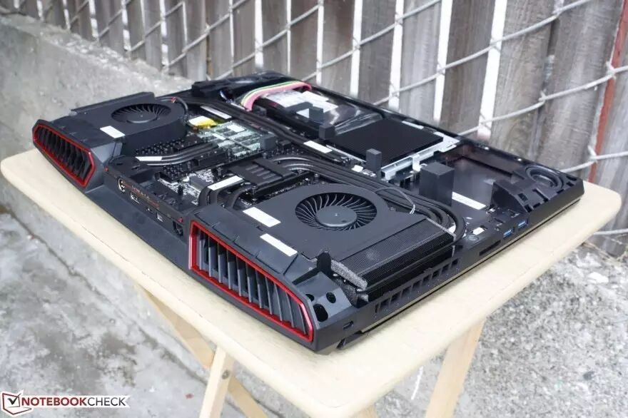 无论是更换还是修复,GT73VR 都可以轻松完成,底部外壳只需要卸下五颗十字螺丝钉便可打开,可以看到,散热装置占据的面积最大,而电池的体积反而还比较小,毕竟这样配置的笔记本,耗电量应该挺猛的。可以看到 M.2槽、2.5英寸 SATA III 槽以及两条 SODIMM 槽。
