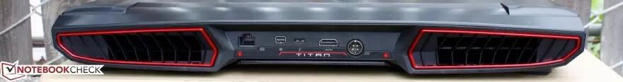 基本上所有你需要用到的接口,都可以在 GT73VR 6RF 上找到,HMDI、mDP、雷电3以及四个音频接口,比较麻烦的是,机身背面的接口双手很难触及,而且 HDMI 接口跟大部分笔记本不一样,它是反过来的,这点有些奇怪。跟 G701VO 和技嘉 X5不同,GT73VR 6RF 采用的是 HDMI 1.4,而不是2.0,制约了其4K 视频输出的能力。