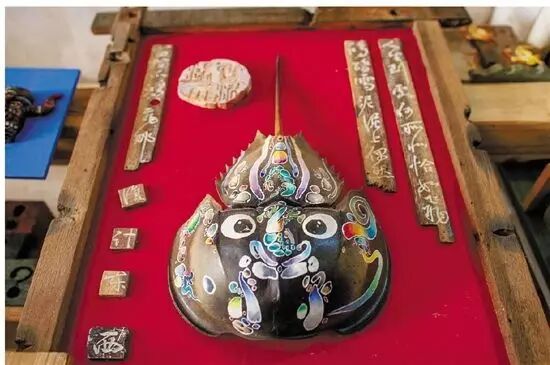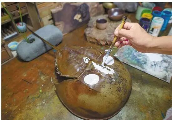 过去,金门在地人常把海边死去的鲎壳做成水舀或用来盛饭,。后来,随着生活水平的提高,鲎壳不再是日用品,而是被用来当做工艺美术品的材料,鲎壳画因此产生。金门在地人将鲎壳画挂在门上或院中,作为保家镇宅之用。