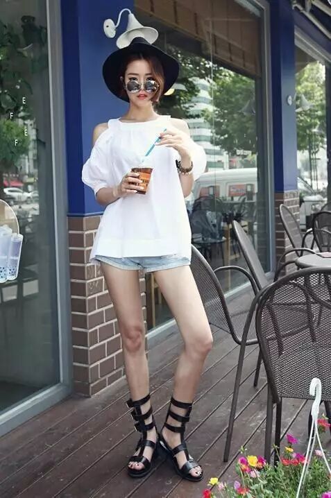 如果想要休闲舒适些的话可以选择一双这季最流行的小白鞋,如果想多些女人味就搭配高跟鞋或者绑带鞋就OK(腿又粗又短的劝你还是不要选择绑带鞋了!)。