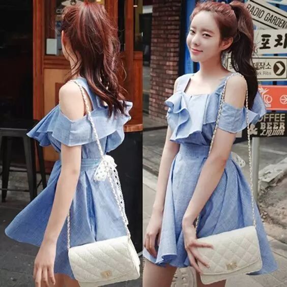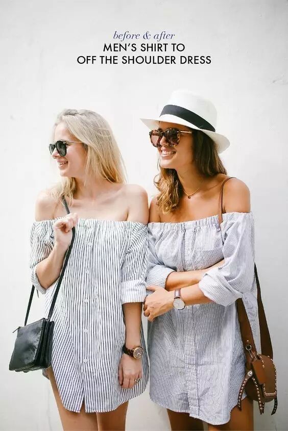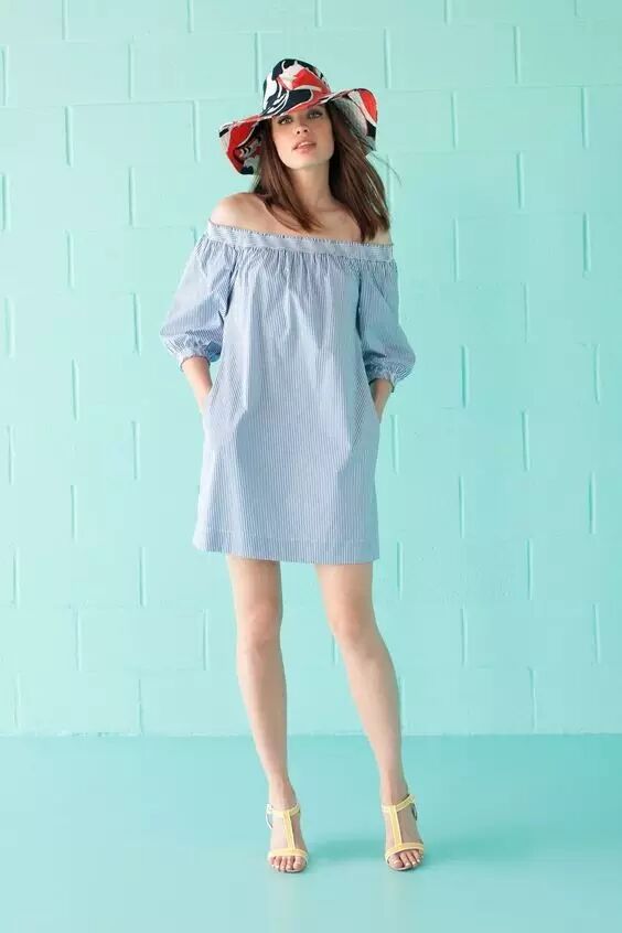 Tips1: 建议身型较瘦小的女生可以选择束腰款式,突显纤腰之余,也能避免把连身裙穿成孕妇装的尴尬。 当然,如果平常能驾驭oversize款式的女生完全可以选择一件宽松款露肩裙。而肉肉的女生则建议你穿宽松款露肩裙,没办法谁让你肉多呢,这样就可以把你的蝴蝶袖和小肚腩遮的严严实实,简直完美!