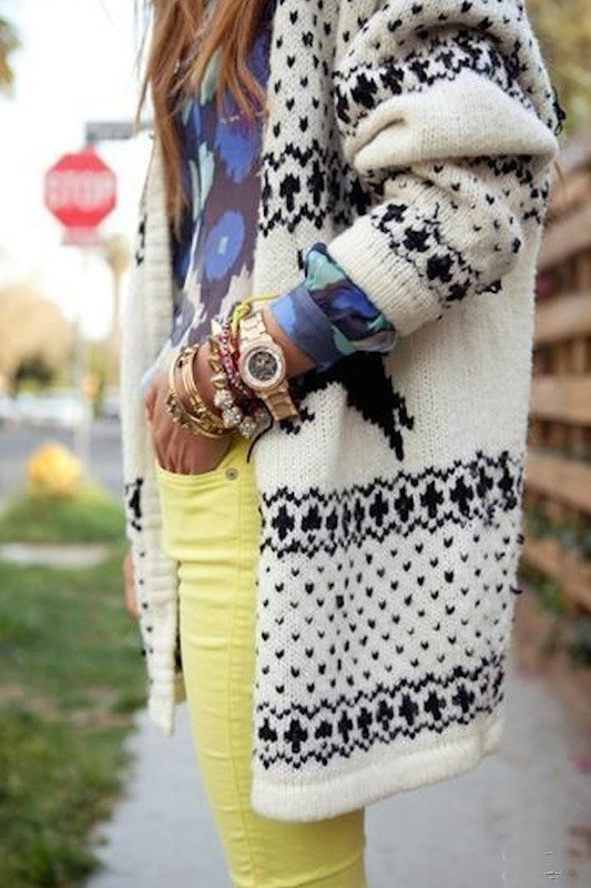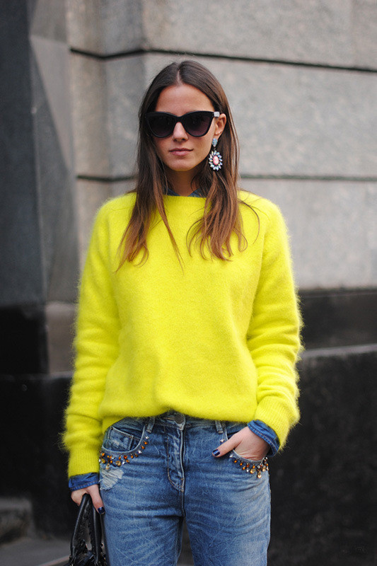 明黄与牛仔蓝的撞色+民族风+黑墨镜,意外的有范儿~