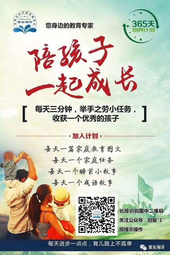 家长海洋倾情打造的365爱心陪伴计划将从今年3月15日起一直到明年3月14日,一共有365天。在这一年的时间里我们每天会给你一个适当的提醒,让你可以在这一天为孩子去完成一个小任务。每天只需花费一段很短的时间跟孩子相处,对他们进行提醒,可以给自己和孩子的成长留下一个更好的回忆,同时也帮助孩子从优秀迈向卓越,更好地成长。