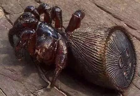 金钱活门蛛是新近发现的蜘蛛新种,雌雄体之比的变化幅度较小,雄蛛体长23至28毫米,雌蛛体长23至30毫米,雌雄体色无差异,尾部圆形,有图文,似古代铜钱而得名,数量稀少,非常名贵。