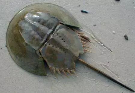 鲎亦称马蹄蟹。肢口纲,剑尾目,海生节肢动物,共4种,见于亚洲和北美东海岸。虽又称马蹄蟹,但不是蟹,而与蝎、蜘蛛以及已绝灭的三叶虫有亲缘关系。 鲎是一类与三叶虫 (现在只有化石)一样古老的动物。鲎的祖先出现在地质历史时期古生代的泥盆纪,当时恐龙尚未崛起,原始鱼类刚刚问世,随着时间的推移,与它同时代的动物或 者进化、或者灭绝,而惟独只有鲎从4 亿多年前问世至今仍保留其原始而古老的相貌,所以鲎有“活化石”之称。又具有很高的药用价值。