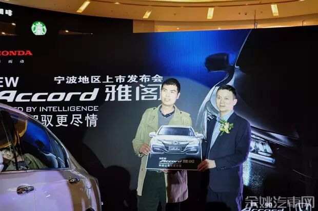 【广汽本田余姚信捷总经理卢守杰先生为宁波地区首位雅阁车主合影】