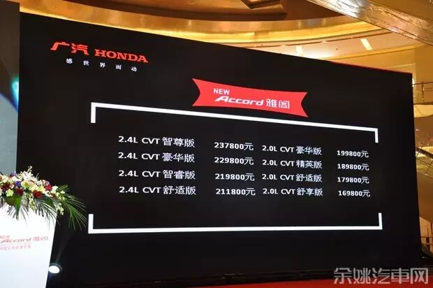2016年3月20日晚,广汽本田旗下全新雅阁在宁波罗蒙环球银泰城正式上市,新车搭载2.0L和2.4L发动机,共推出8款车型,售价区间为16.98-23.78万元。