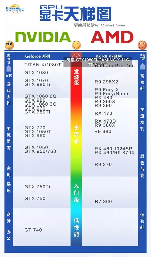 天梯图说明:毋庸置疑,微星GTX1080Ti Gaming X 11G位列公版GTX1080Ti与TITAN X之上。
