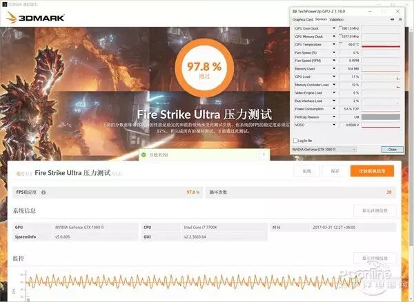 在把Fan Speed、Temp.Limit和Power Limit都拉到最高后,笔者将核心频率和显存频率分别在原来的基础上拉升了100MHz和1200MHz;然后跑了一轮3DMark,得到如下结果。