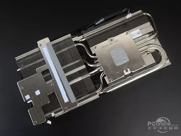 卸下来之后可以看到一个超大超厚实的散热器,4条8mm纯铜热管和GPU纯铜底座焊接在一起,还专门为显存颗粒和供电模块配备了金属散热片,与鳍片焊接在一起,可以快速将热量散出。