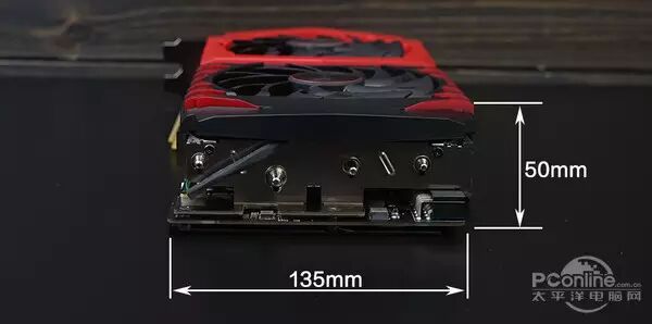 整卡尺寸为277×135×50mm,属于长度稍短(比常规三风扇显卡短一些)且较厚的产品(占两个槽),一眼看去相当厚实,内部鳍片之多可见一斑。