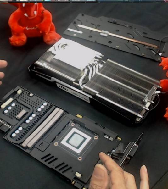 已经全完拆解的GTX 1080 Ti LIGHTNING Z 显卡,我们看到散热背板镶的热管可以与PCB紧密贴合,从而快速传递热量。