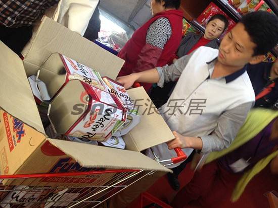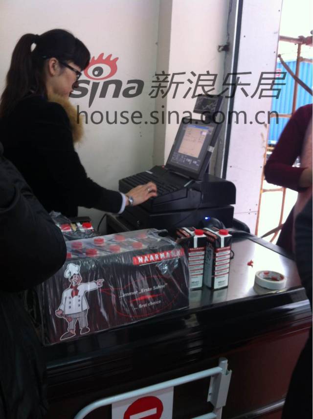 现场一楼销售点已经对外开放,工作人员正往货架上摆货,包括饼干、饮料、酒水和纯牛奶等,已有顾客选购好商品到收银台买单。