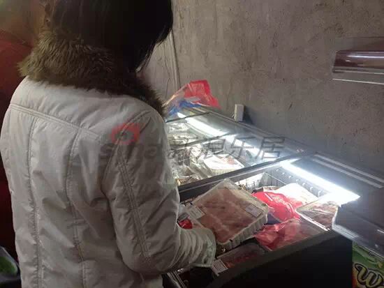 冰柜内的冰鲜产品不少,有肥牛、北极红龙鱼、牛仔骨等等,有位阿姨特意过来选购肥牛回家打火锅。