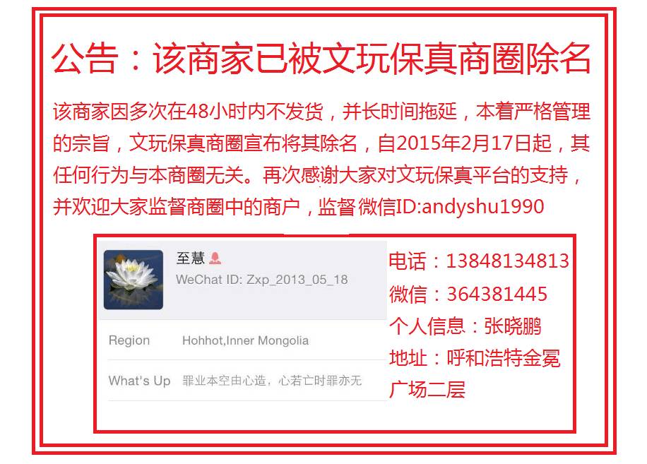 文玩保真商圈,为目前审查最严格的网络微信商圈。所有商圈内商户,均在相关行业具有极高威望,拥有大型实体店(办公室),且为一手货源经营,是您可靠的文玩伙伴。