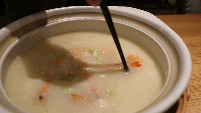 当干贝鲜虾粥端上来时,浓稠的汁水靠着砂锅的余温,伴着咕嘟咕嘟的声音,正在滚着泡,用大勺搅拌着便不断散发还夹带着鲜香味的热气,舀一勺,味道十分鲜美,还有又大又鲜的虾,吃一口绝对还想再来一碗。