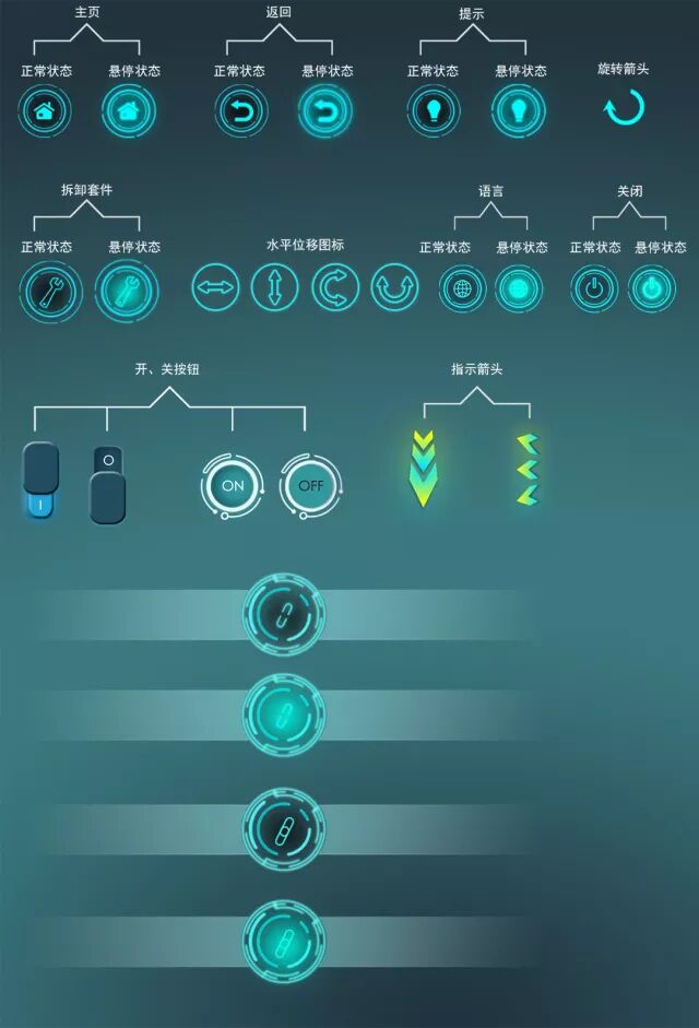 采用了蓝调作为主要色调,加入其它一些色彩使得更有内容。也融入了工业的风格,比如:扳手、电灯。整体色调比较明亮,在交互过程中更容易识别。另外通过不同颜色来区分交互的功能,并通过小符号加以明确其作用。