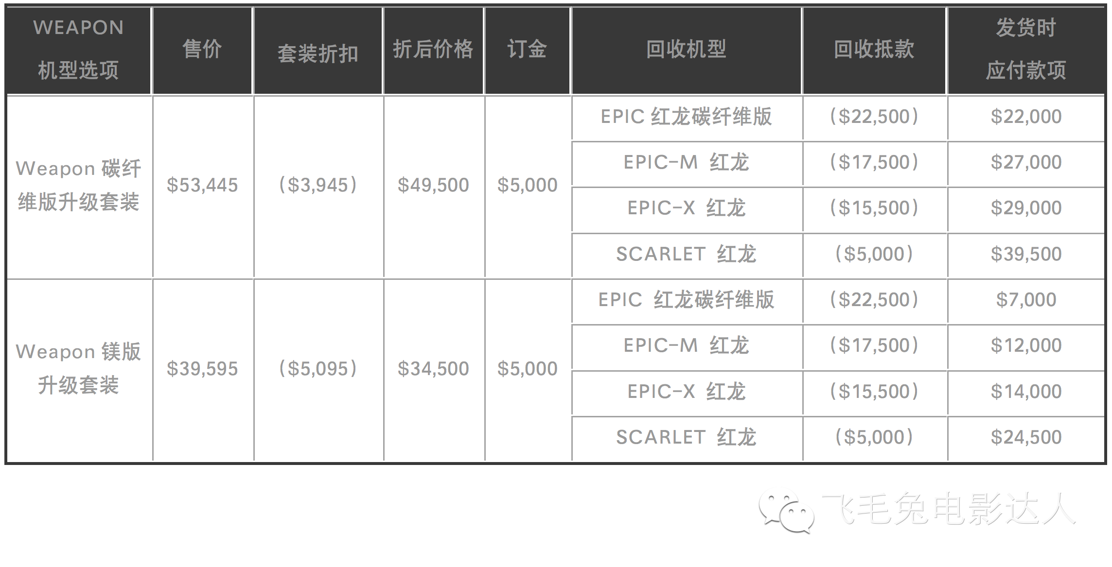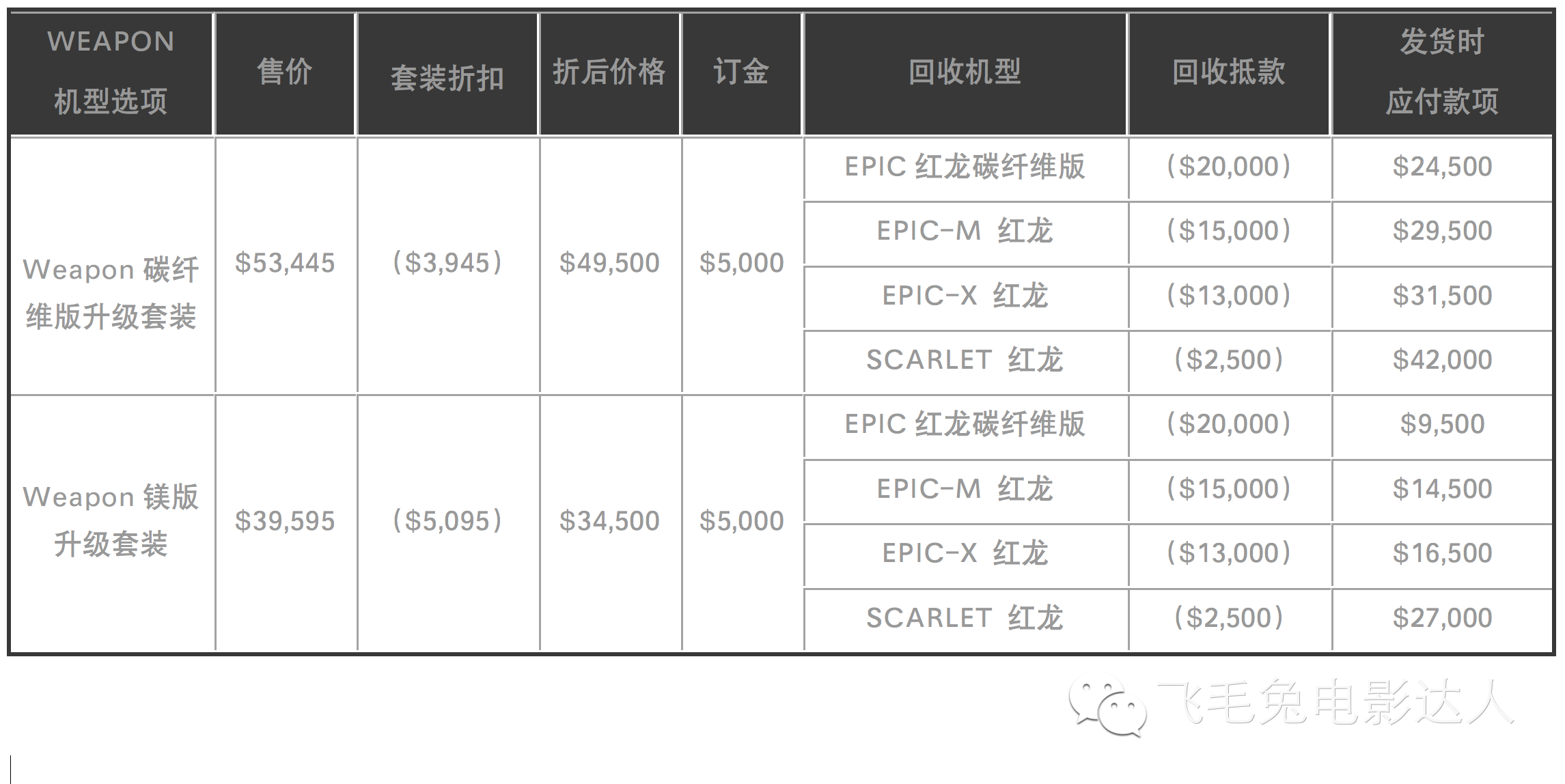 Weapon碳纤维版升级套装折后价49,500美元,EPIC-M 红龙可抵17,500美元。