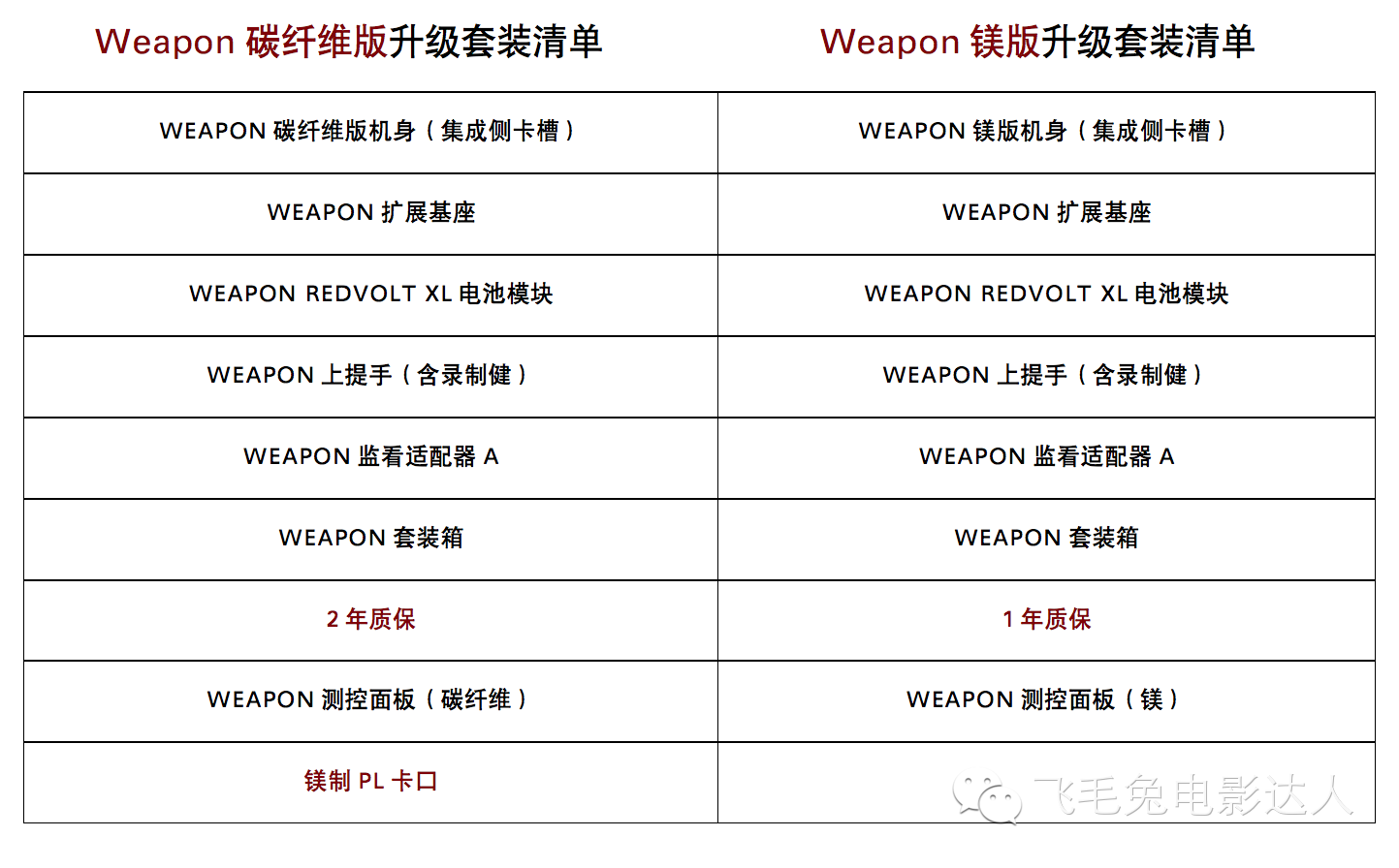 下面的表格是RED官方公布的Weapon摄影机定价信息。
