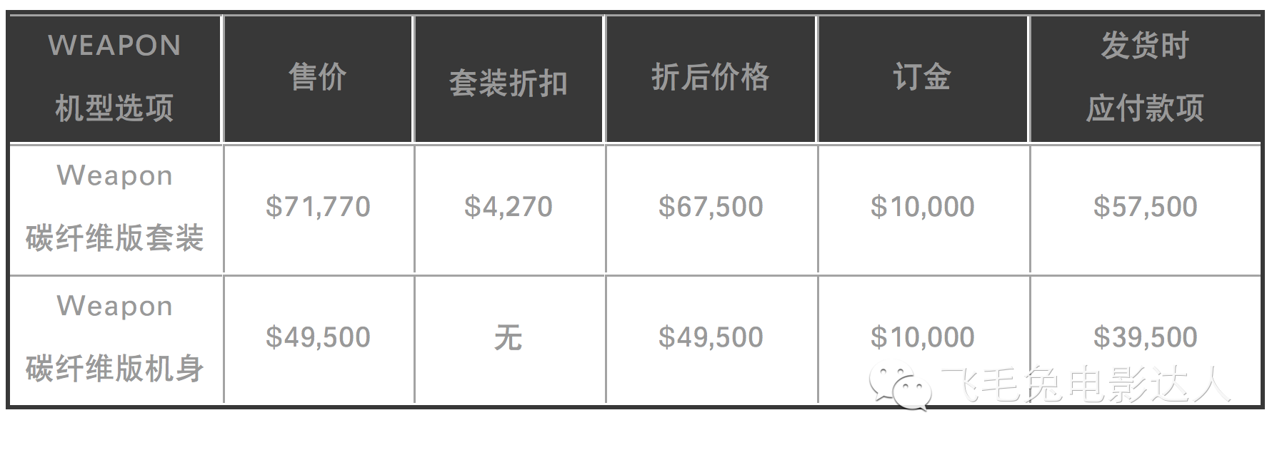 再来看看Weapon碳纤版机身的价格,机身不享受折扣优惠,总价49,500美元,大陆预估价40-45万人民币左右。