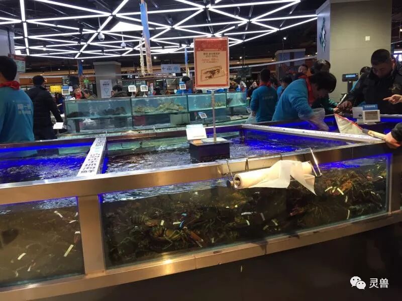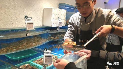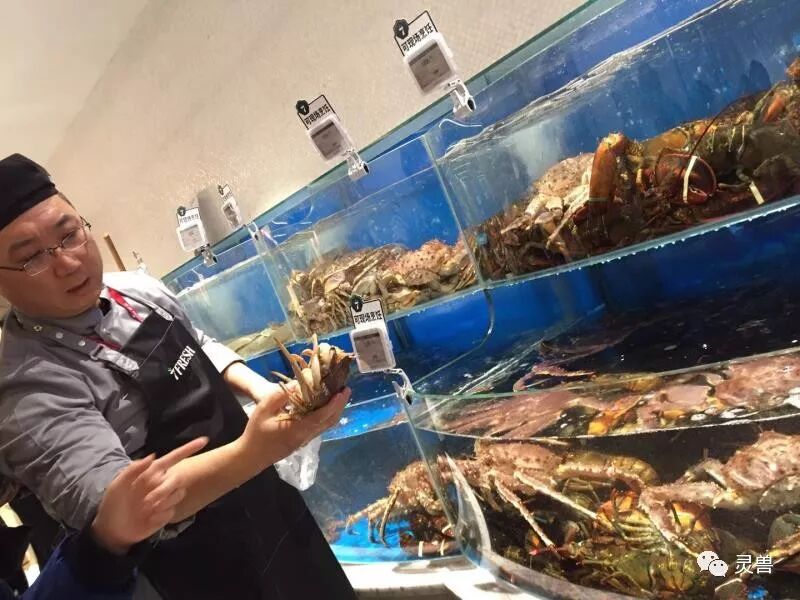 但在7Fresh,因为在水产售卖区设有防护栏,消费者不能近距离接触海鲜产品,只能让防护栏内的两位工作人员为用户打捞,而且面积比较小。在国内买海鲜,还有不让消费者近距离接触的吗?