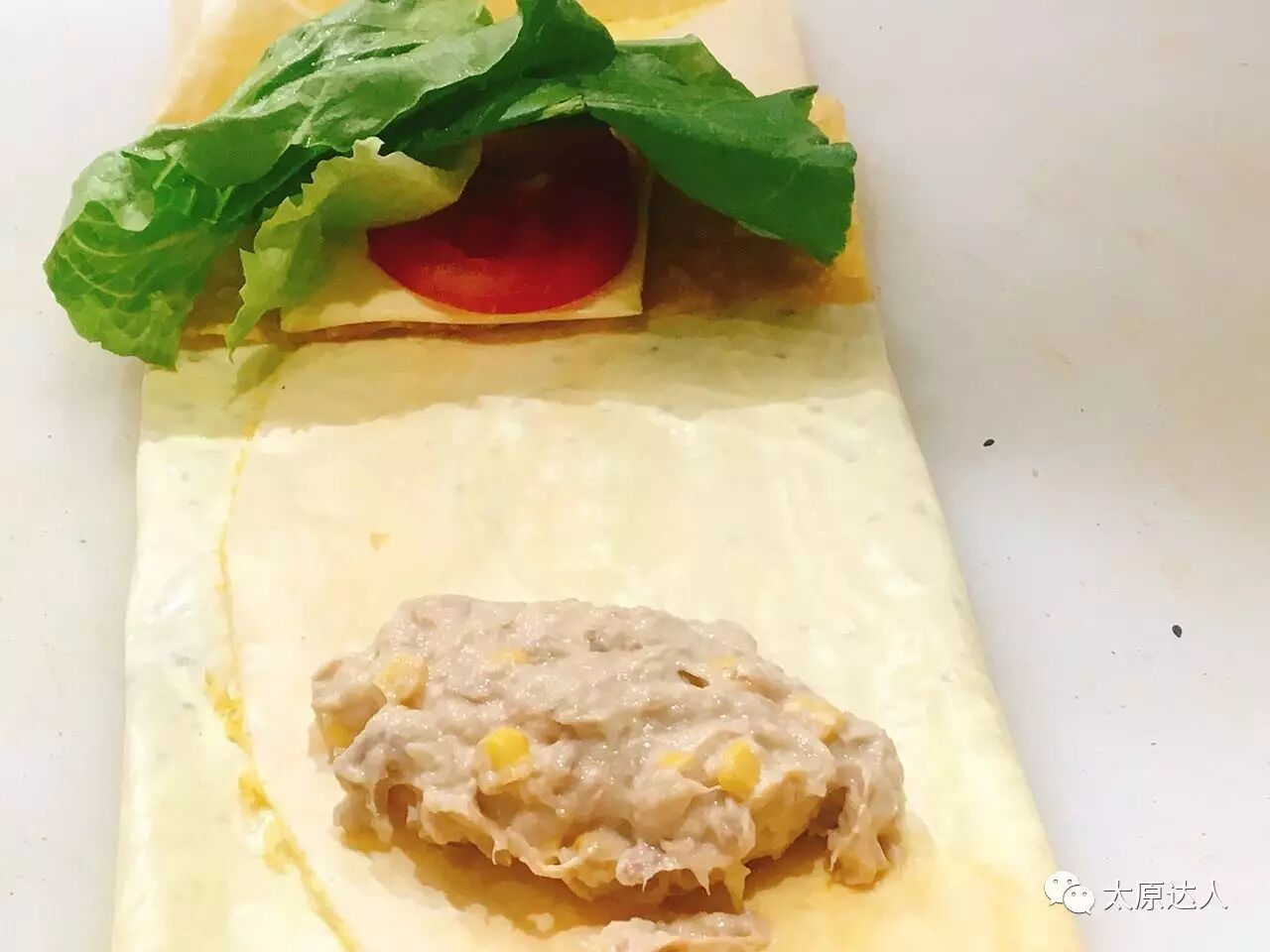 满满一大勺金枪鱼肉酱,包好后微波炉加热至芝士融化