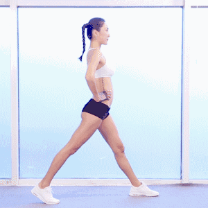 双腿前后劈开,间距约半米,下蹲,直至前后腿呈90角度,做完一条腿后,换另一侧做。