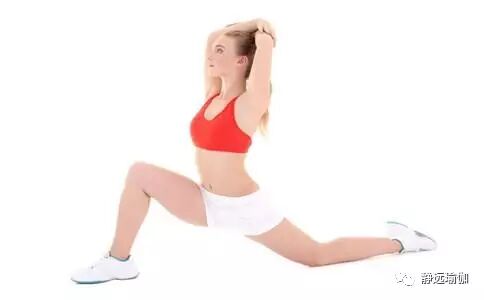 双手放下,重心继续下移,同时上身扭转,做箭步蹲的姿势,两腿重复进行,此动作可以拉伸到小腿肌肉。