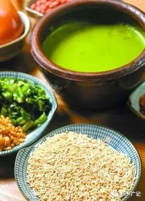 店内还有一种没有茶叶的茶,叫陆河油茶,在当地走苦甘派。陆河油茶的材料包括艾草、薄荷、苦刺参和雷公精,主要功效是健脾利咽喉。在这家店里,程程没有加雷公精。油茶的配料可以很多样,油麦菜、菜心、芥蓝、菜脯、小麦、糯米、炒米、虾干、花生等,有些人甚至喜欢加青豆和香菇。其他材料可以随意,但是炒糯米和炒米一定要最后加,才有那个口感。
