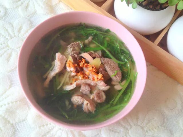 郑:我会带她去吃一碗益母草汤,因为潮汕地区气候湿热,大家很容易上火,就经常喝益母草煮的汤,里面有猪肉、猪杂、猪血什么的,就可以排毒养颜啦,吹得特别神这个汤,但是它特别好喝。早上我们就特别喜欢吃这个东西,围着街边的排挡一坐,两碗粗肉端上来,在带有一丝寒意的早上喝上一口热热的益母草汤,就感觉十分的暖情调啊。