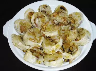 这道小食以脱净脂肪的猪肠为“容器”,里面填装香菇、木耳、虾米、板栗肉、鹧鸪卵、盐、味精、水和糯米等原料,首尾紧束不使其漏水漏料,放进锅里煮熟。煮熟后切开来,里面的糯米熟而不烂,各式佐料分布均匀,且任何地方的咸淡都相当。要达到这种水平,关键是配料与水的比例要恰到好处。水少则糯米难以熟透且外观干瘪,水多则口感不爽且猪肠容易胀破,这所谓“多一分则肥,减一分则瘦”。好吃是好吃,就是明知听起来不大文雅,使得很多女生望而却步