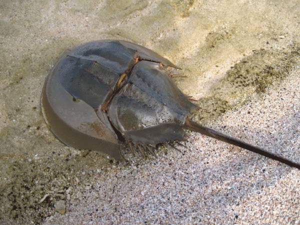鲎由三部分组成:头胸甲略呈马蹄形(故名马蹄蟹),腹部呈六角形两侧具棘刺,尾部是一根长的尾剑。鲎似蟹,比蟹大,生活在浅海沙质海底。