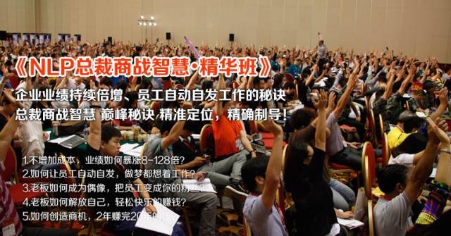 本咨询内容就是带老板们找到业绩突破的三扇窗,只要老板集中精力做好这三个板块,业绩就会爆炸式增长。 中小企业老板还有一个头疼的问题就是太忙、太累、太操心的问题,本咨询内容就是运用NLP心理学原理,调动高管潜能,让他们自动自发为公司而努力,找到更多解决办法,这样老板就从企业中解放出来了。