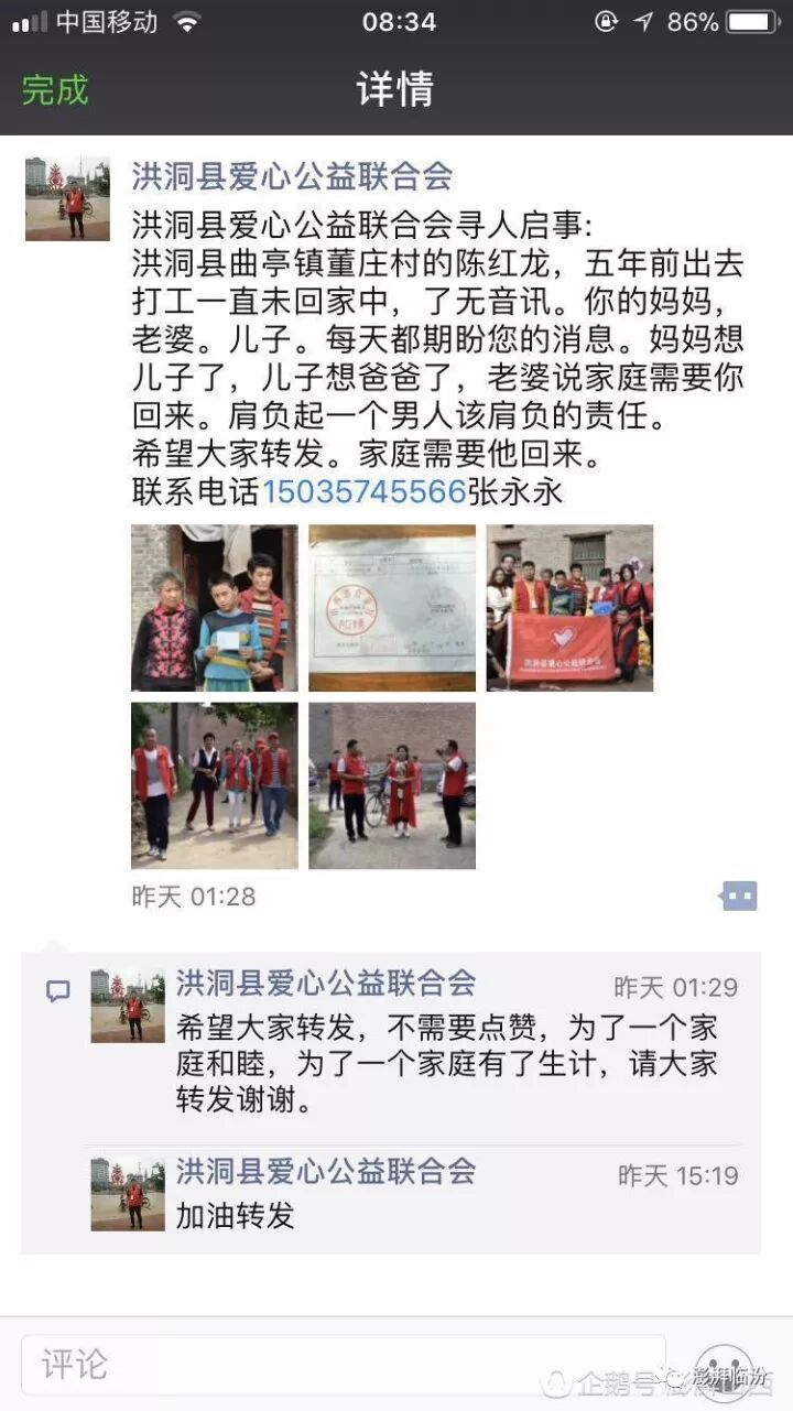 为此,媒体及洪洞爱心公益联合会希望陈某本人看到消息之后尽快与家人团圆,肩负起一个男人应有的责任,这个家需要你!同时呼吁全社会转发寻找,有陈某相关信息时恳请及时联系张永永:15035745566