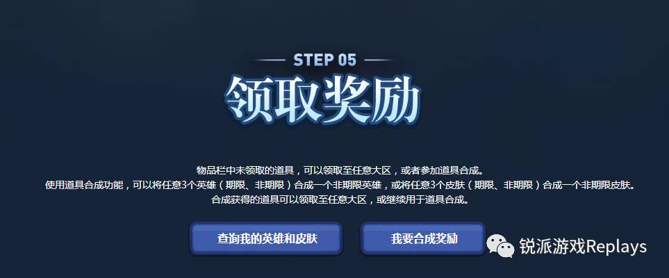 物品栏内未领取的道具可以领取至任意大区或者参加道具合成,而道具合成是可以将3个英雄(限期/非限期)合成一个永久皮肤亦或者非限期皮肤,大家可以将已拥有的去合成,来合成自己未拥有的皮肤。