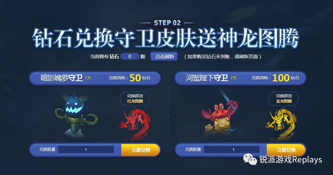 用第一步购买的钻石兑换暗影魄罗守卫/河蟹陛下守卫,同时赠送红龙图腾/金龙图腾。