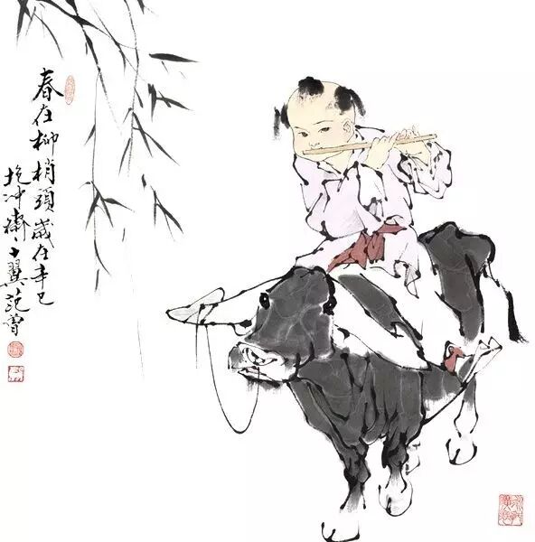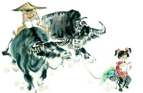 【简析】一个小牧童拿着三尺长的竹鞭,骑在这头老牛背上,驾驭老牛,竟然把老牛都吓得颤抖。一边是小小的牧童,一边是庞大的老牛。可是小牧童威风凛凛,怡然自得,老牛却乖乖驯服,甚至瑟瑟发抖。诗人黄庭坚,下笔为之,写得多有趣味,多有姿态。