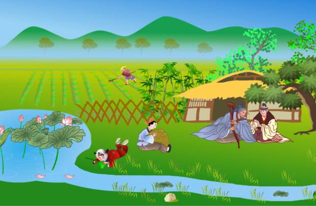 大儿锄豆溪东,中儿正织鸡笼。最喜小儿亡赖,溪头卧剥莲蓬。