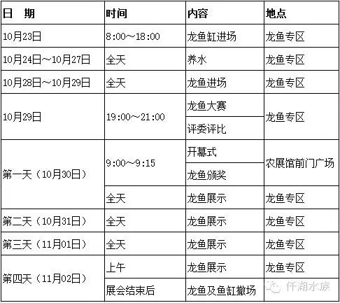 时间:2015年10月29日评出名次,10月30日至11月02日(周五至周一)龙鱼展示。地点:2015第十届上海国际休闲水族展览会现场(虹桥路2268号上海农业展览馆)。网上报名。展会官网http://www.fishery.org.cn/下载《龙鱼参赛报名表》,填妥发承办单位电子邮箱,报名截止日期为2015年10月20日。根据参赛报名时间先后,决定参赛名额数,主办单位有权提前截止报名日期。