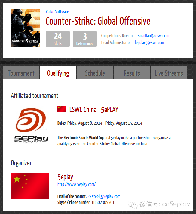 6月,ESWC法国组委向5Eplay易玩网透露消息,今年有望在中国设立自己的预选赛,但需要5eplay主动找到赞助商解决所有赛事费用。作为一直致力于CS系列游戏在国内发展的5Eplay.com(易玩网),我们在收到消息后立即联系上法国组委会,经过不断的沟通与努力,ESWC正式授权ESWC2014中国区预选赛由5Eplay.com(易玩网)承办,而我们也在法国组委会承诺的时间内落实好赛事赞助商。所以5Eplay.com代表中国CS爱好者对本次ESWC赛事赞助商表示最大的感谢和支持!